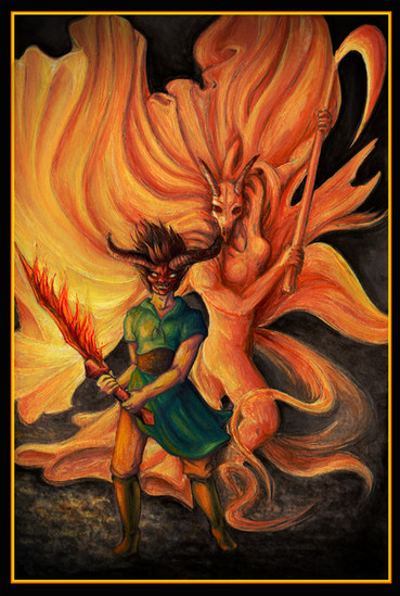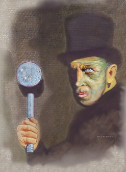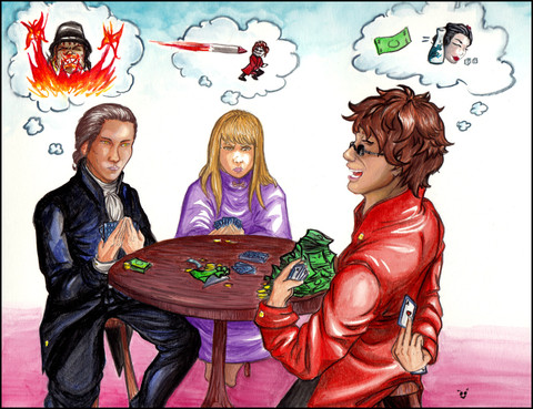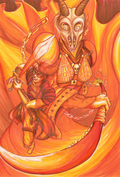 Rodion (Rodya) Raskolnikov murdering an old pawnbroker in Dostoevsky's Crime and Punishment. He believes this act will help him discover whether he is one of the common people or a "Napoleon," or "superman," one who able to step over the usual laws and social constructs against murder in order to do great things.Later, though, Rodya feels more like he's killed himself, and that it 'was the Devil who killed the old woman.' Similarly, during the act, he's been sick and is amazed he had the strength to pull it off. So I fixed his shadow with some shady devil hands