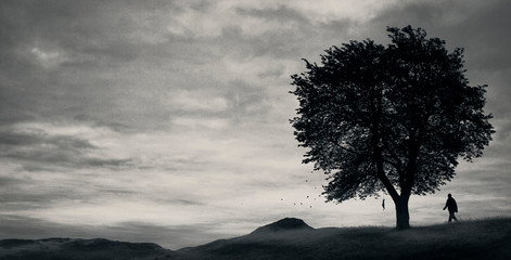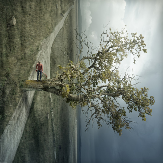 A very interesting piece yet the shadows don't look real, especially the man's shadows.. the direction of the shadows are not the same as the trees' shadows! You should plan where the light(a) is/are coming from!