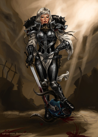 She looks powerful and intimidating! I love how covered in armor she is, and that giant sword! The motion you added to this image as well is impressive!