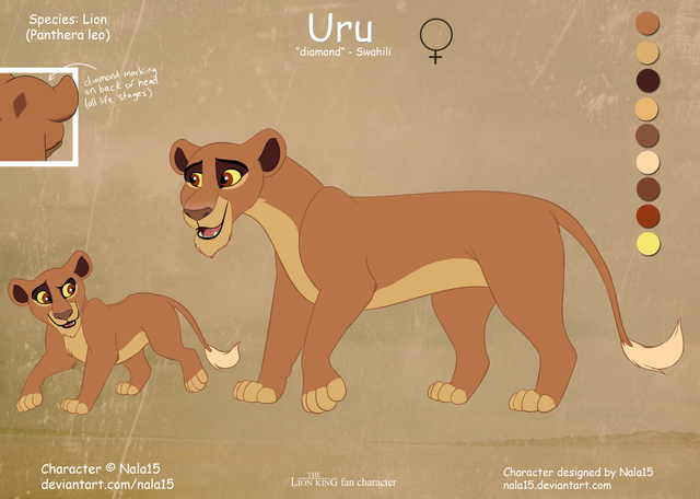 I will not say much about the role she plays in my TLK universe, because I'll reveal it in my later stories/ comics. I can only say (as an explanation of the title) that Uru and Ahadi are cousins (in my TLK universe, off course). Such a thing wasn't such a big deal in some ancient (and later) cultures, though: marriages among the same household/ dynasty were contracted either due to political matters and/or to perpetuate the royal line, and for some other reasons too.