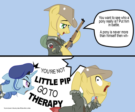 Good lord it's been a long time since I drew Little Pip. Ever. Did I ever draw her? I don't know: but it's been a while.Anyways, decided to go back and re-"read" Fallout: Equestria. As in: I got it on audiobook to listen to while I do work and shit. Got up to and past the chapter with Stable 24 and this is what came to mind.