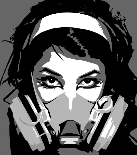 I love the variety in colour in this piece. My eyes are immediately drawn to her eyes, which is aided by the scarf on her face. I think it would be an equally strong piece using only the red, white, sepia and black. However, the colours are a happy addition.