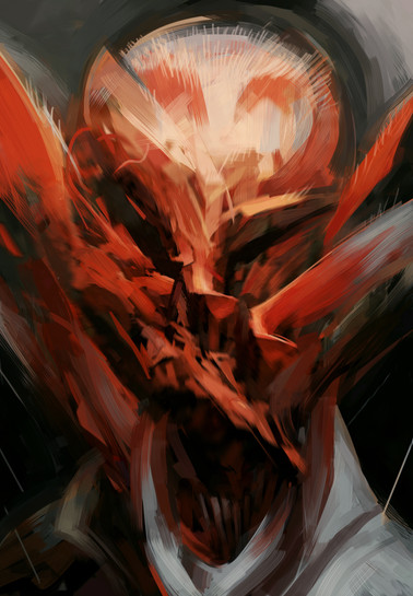 I actually really love the really primitve colouring and sketching on the edges that seems to be focused and refined as it comes towards the head. Really draws you into that focal point. And mmm, what a kick arse focal point it is.