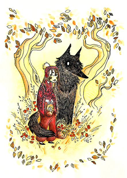It is absolutely wonderful! I love that the wolf is sort of leaf-y it gives a sense of something wild, and natural, he is almost gives a vibe of some sort of a Β forest spirit! There is no menace from him, but his organic wild nature is clear and Red doesn't seem scared of him. It's simply perfect!