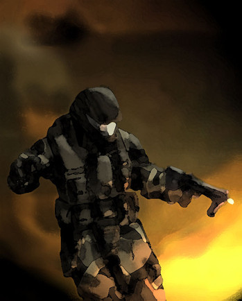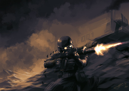 i like the colours in the background and the gun-blast. looks good. and silhouette of the soldier is nice too.