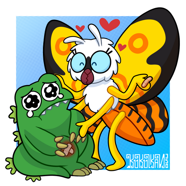 Looks like one of Mothra's larvae had bitten Godzilla's tail. Luckily, it's been taken care of. ^w^This is actually based on a picture in the Godzilland merchandise line. XD I simply recreated it in the style of the OVAs. 'w'