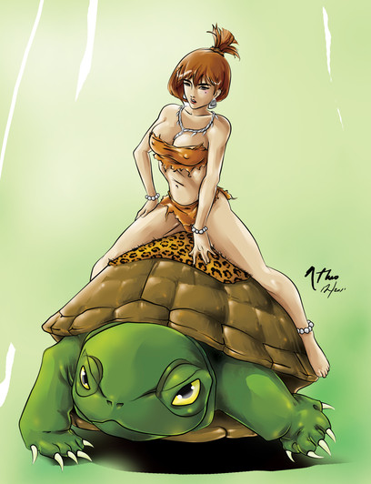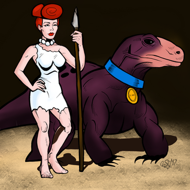 A digital painting of teenage Pebbles with their pet Dino from the cartoon series 'The Flinstones'. I used her baby outfit instead of the pink onePainting created from Photoshop