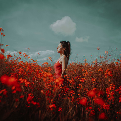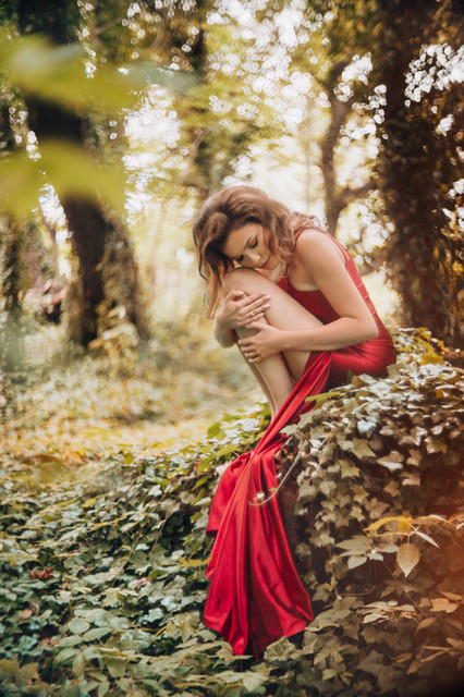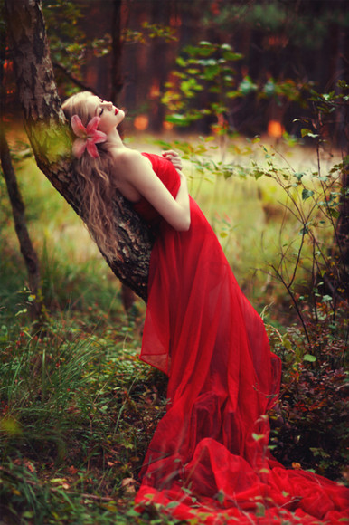 This is all beauty; the red, the composition, her... Is a beautiful photo. Congrats!