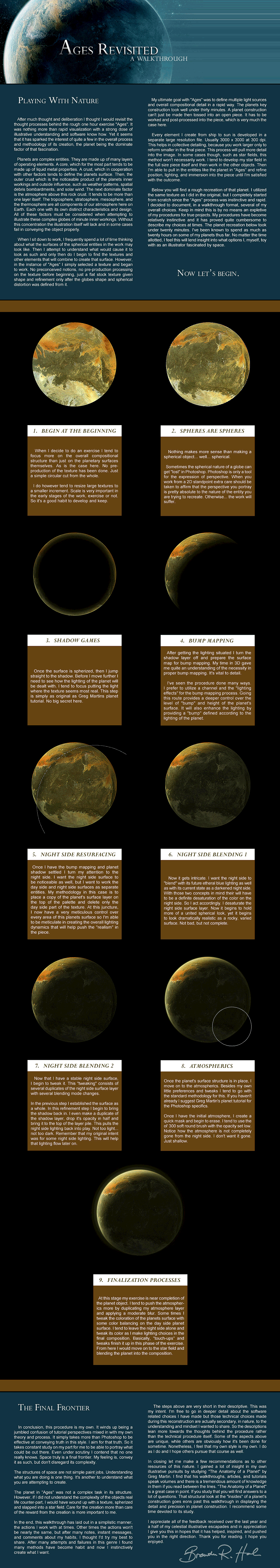 Ages garnered a lot of requests for a tutorial on my methods for planet creation. After talks with Greg concerning the detrimental effects of tutorialization and cookie cutter work being done in the genre. (which was the reason for the hiadis to begin with. I was frustrated with the lack of inginuity in the genre. Mostly it was kids grabbing a ripped copy of Photoshop from the internet and following a few tutorials to be cool and nothing more. Most of which have moved out of the fad and moved on but there are a few left, I find, that still for the most part have this same mindset but are getting plenty of attention so they stay fed. To my disappointment. Several of the pros felt the same and thus little interaction has become the norm for several of them. The genre has become a stepping stone and in those regards it has lost a bit of it's original flare.) /end rant.