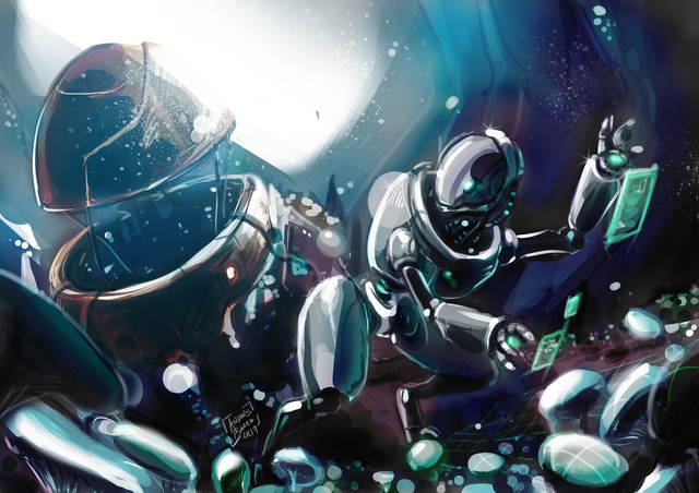 slowly getting back into uploading some art. had some health issues preventing me from getting anything but studies done for almost 2 months . felt bad but its getting better woohoo. couldnt come up with a witty idea as to why the robot is approaching the lake with arm floats but yeah. take a look at that image and move on. like meRelated content