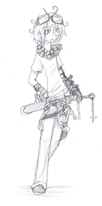 Wow, cute bishounen. I love the facial expressions, kind of gives us the general idea on what the character is like...kind of. I don't know much about him, since he's, well, your character. But I LOVE his attire! Ooo...chains...belts....