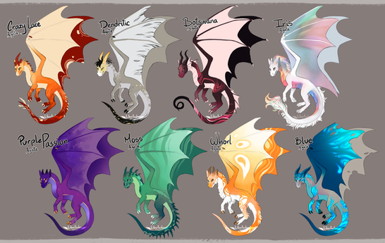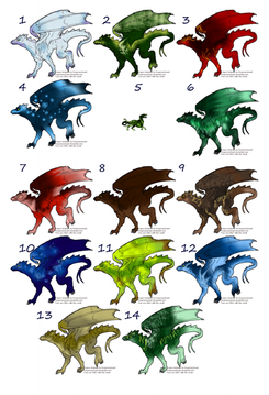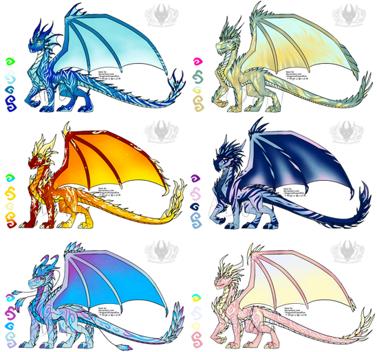 Fourth Row:Β This is going to be a short analysis because it is currently 11 o'clock and my procrastination has reached its peak, with the panic monster reaching into my heart.Β The symbol reminds me of mysticism and the designs of the dragons indicate a contrast that reminds me of a Willow the Wisp with little aspects of light leading someone into the night.Β I believe that these dragons will have the ability to conjure illusions or induce hallucinations.Β I would say a word that I would associate with them would be Phantasm.
