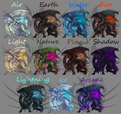 First Row: The symbol and first dragon remind me of a death mask, or a face that I would see whilst looking out my window at night.Β The second dragon reminds me of the Angel of Death or a Grim Reaper that swoops down on its victims in the night, with its wings reminding me of a cloak traditionally depicted as being on the Grim Reaper in today's media.Β The third reminds me of a skeleton based on how the design seems to draw the eye towards how stark and simple it is with the spines running down its back seeming to be more prominent compared to the other designs that I've seen thus far, bringing about a more prickly, plain feel to it that feels like it is hiding something in plane site, or a memory of a time past.Β I don't want to say that I would call the element Death, but I would more like to refer to it as Tenebrous or Umbra, words typically used to convey a sense of dread or gloom.