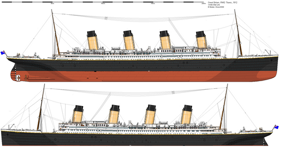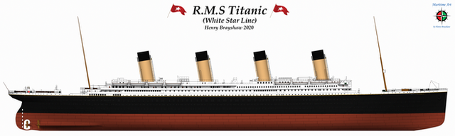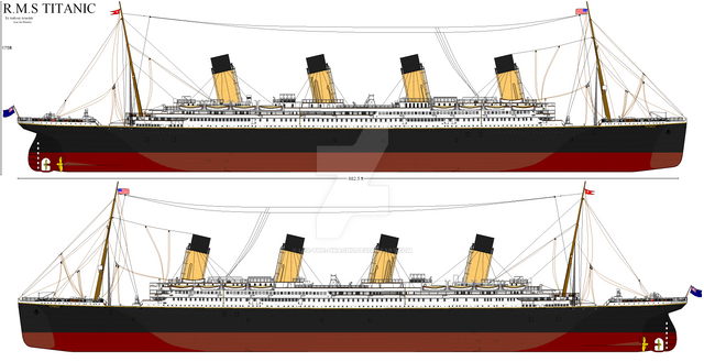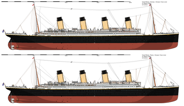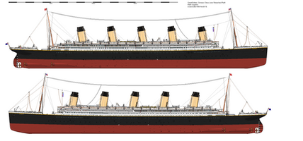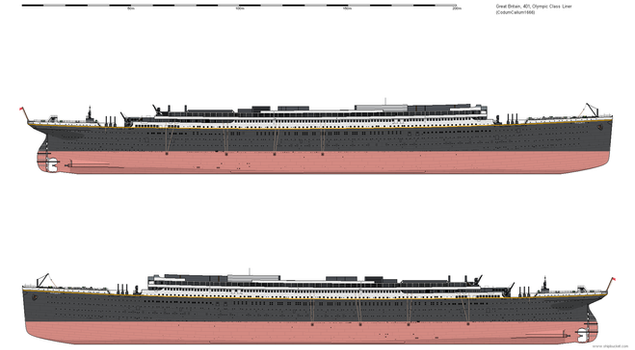 Same treatment as the Titanic drawing. There are much more differences between the Olympic and Titanic than just window placements and a promenade deck.Version without lifeboats: