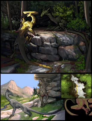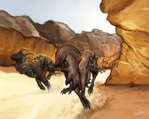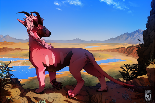 Little slice-of-life piece I've had in mind for a while. Even though I've mostly sketched the arboreal side of nagogin, a good chunk of them (mainly red-morphs like Burn) prefer to inhabit the deserts and mesa ranges of the Spine. The morph's camouflage and greater physical strength makes them the absolute apex predators of these regions, though they must forgo the prey security of the jungles.