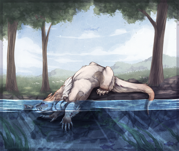R-056 [Burn] stops to take a drink of water as they travel through Red Gouge, one of the three natural valleys through the cliff system separating the Southern Jungles from the desert-like Fellenlands north. While Nagogin are one of the few land-bound species capable of scaling the Gourge's treacherous walls, R-056 does not. It's likely that they are unable, or perhaps they would rather remain close to the only water source for kilometers. Either way, their migration is a slow - but peaceful - one.