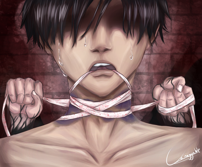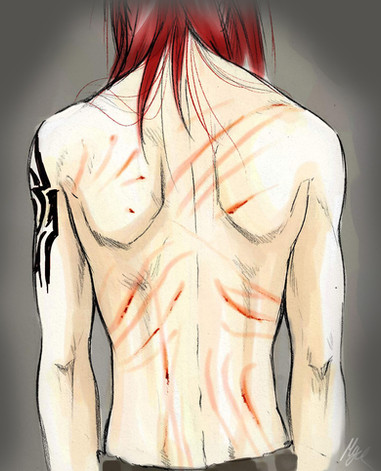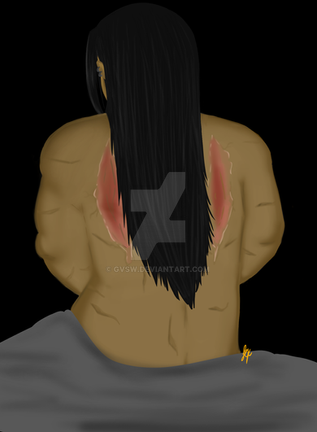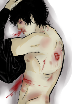 a 2015 redraw from a 2014 piece!! originally the picture of Hachi's brand was a meaningless picture just to show that he had it and after time it started meaning so much more to me. so i redrew the picture. you can't really see the one-winged butterfly brand that well because its a burn and burns arent always as pronounced as cuts. and the cuts on his body in the photo are recent ones.art and character by acesblitz, me