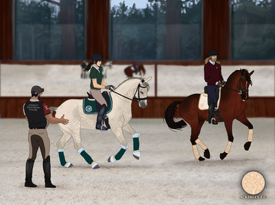 Continuation of AEC warm upIt was quite early when the senior instructors at AEC arrived into the riding arena. Samuel O'Donnell had ridden in the tests yesterday and was going to attend the riding instructor course at AckerleyEquineCenter . He had applied for the possibility to bring his horse, OLS Cyclone , which meant that the gelding also needed testing. The requirements for being able to take part of the RI program with a horse was that the horse was steady and at medium level or higher. It should be able to perform both show jumping and dressage exercises. Samuel had warmed up Cy-fi when the instructors arrived and they began by watching a bit. Marianne Zetterlid would stay on the ground for the whole test, being the cross country specialist meant she didn't have much to test when under the arena roof. She was also the instructor with the worst temperament, so Gustav and B had learnt to not let her tell the newly accepted student her exact thought about their, often very cherished, horse. Instead Bartholomeus Gray took over the saddle after Sam and tested the basics as well as capacity for collection. B found Cy-fi to be a hard worker with a sound mind that could use a bit more throttle. (But he found him to be a fine horse). Last rider was Gustav Nordlander . He mumbled instructions to Marianne and B as they quickly built the obstacles he asked for. Then he rode for only 10 minutes and then he dis-mounted and returned the horse to Sam. He nodded to B and B looked at Marianne who said she had no objections. Then B declared that the horse was accepted and told Sam to jog him off. The trio of instructors all had more places to be, so after quickly putting away the obstacles they left Sam alone with Cy-fi to finish.