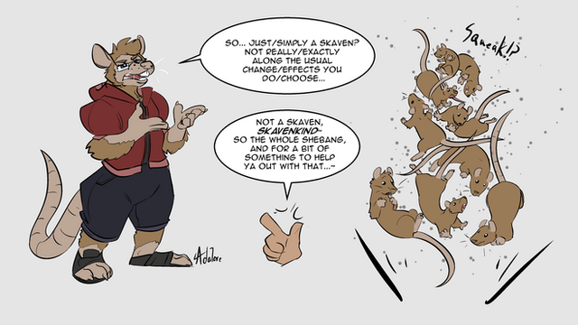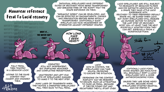 This is my vaguely "Main Fursona" character who gets neglected because he is in no existing setting. But no more, he is now a part of the Manatear setting as a Spellfluxed and now will get bothered by all the numerous problems in that setting. This means I had to adjust him a bit into the setting but that wasn't that hard. I maintained his "Chronic-toonism" trait, which also requires implementing it into the setting.He'll be setup backstory wise like a good number of the Manatear cast as being from outside and once human. If I ever get to making my dumb game he'll probably be turned into a pre-build for the game and get some other traits represented of mine represented in game. He'll probably be the only way to start the game with chronic toonism without gaining it during play. (One of the ways to gain this "Totally favorable trait" is to drink too many inky toon potions to solve problems.)