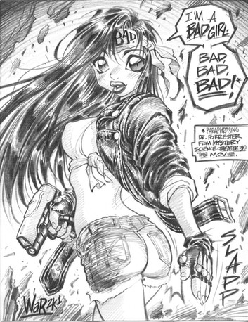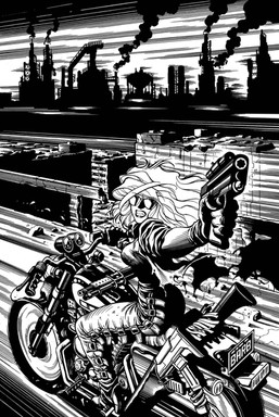 An old and deeply flawed commissioned sketch of DC's character Lobo... Note that I screwed up the, uh, perspective on his pecs (now, THERE'S a phrase one does not often hear), and the fact that his face (well, his CHIN, mainly) is more than a tad asymmetrical. Oh, well.Much of my work displays a MASSIVE right-hand bias, alas... I generally don't have the time to "mirror" or flip over a piece to check for bias/ distortion in my art, so I usually have to just wing it (and "use the force," if you will), "eyeball" the piece, and hope that the resulting degree of asymmetry doesn't wreck the illo entirely.
