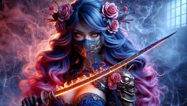 #ai #beautifulwoman #characterconcept #characterdesign #digitalart #digitalcreation #digitalpainting #fantasy #fantasyart #fantasycharacter #fantasyweapon #fantasywoman #flamingsword #goddess #intricatedesign #maskedwoman #portrait #portraitbeauty #sword #wallpaper #warriorwoman #weapondesign #mysticalfantasy #powerfulwoman #intricatedetails #aiart #fantasybeauty #fiercebeauty #vibrantart #fantasycreation