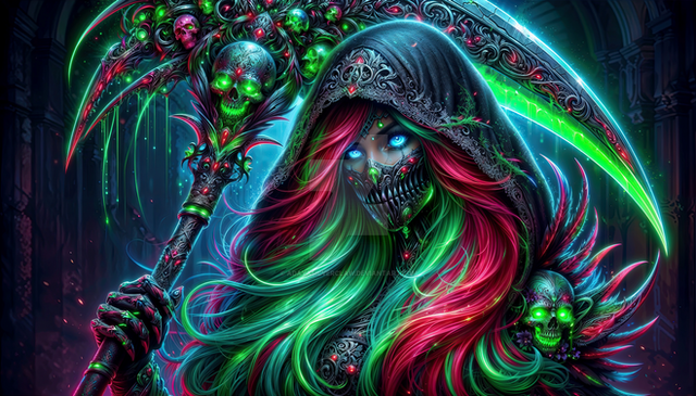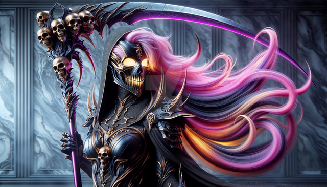#ai #characterdesign #conceptart #coolcharacter #dailydeviations #darkfantasy #digitalart #digitalartwork #epicfantasy #exclusive #fantasy #fantasyart #fantasyartwork #fantasycharacter #fantasywarrior #fantasyweapon #fierce #glowingeyes #pink #scythe #skullface #warriorwoman #weapondesign #digitalcreations #mysticalfantasy #aiart #badasscharacter #fantasybeauty #undeadcharacter #fantasycreations