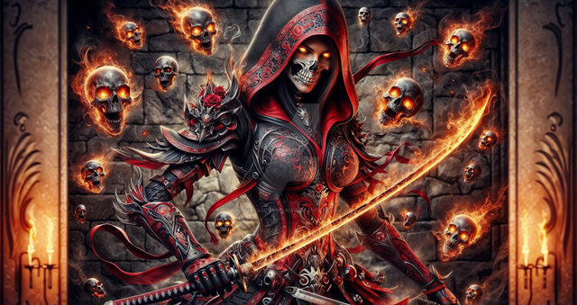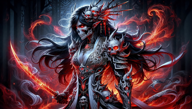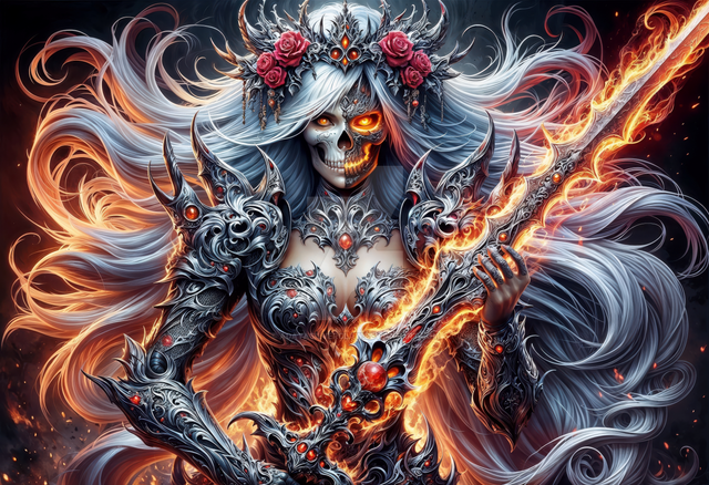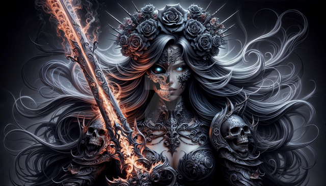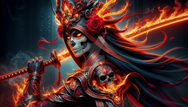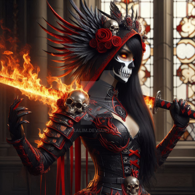 #ai #beautifulwoman #characterdesign #conceptart #dailydeviations #darkfantasy #digitalart #digitalartwork #edited #epicfantasy #exclusive #fantasy #fantasyart #fantasyartwork #fantasycharacter #fantasywarrior #flamingsword #intricatedesign #portraitstyle #skullface #sword #wallpaper #warriorwoman #weapondesign #blackandredhair #digitalcreations #aiart #undeadcharacter #fantasycreations #mysticalfantays