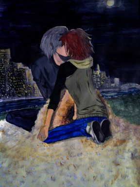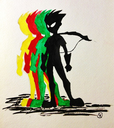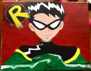 I finally got it finished! This took be days to complete because I kept changing ideas and paint.The concept is robin in teen titans and what he could have become. I decided to use the quote from the episode about fathers because I believe one of the critical factors of Robin's heroic personality is, of course, Batman's influence. This picture almost is a "what if" with the other side being a representation of Slade actually becoming a father figure to Robin (whether forced or willing). Its that confrontation with his mirror image of the person he doesn't want to become also.