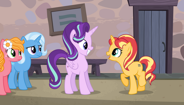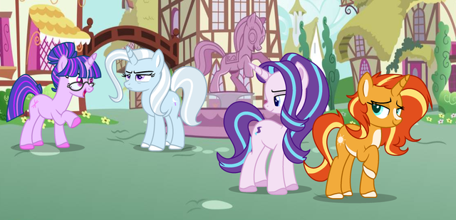 This began as a wrestling match between The Great and Powerful TRIXIE and some unimportant background pony named Sunset Shimmer ... but then I changed EVERYTHING! And now I don't know what's going on, but I guess Twilight is bringing Trixie home to Ponyville, and Coco's gonna be Sweetie's new big sister or something (I bet they'd get along like peas in a pod). Sunset is only there because someone paid her ... to, um, teach Scoots how to wrestle ... um, yeah. Either that or she's on her way home and doesn't like the company.I can't believe this is the first piece of art I post since Season 4 began.