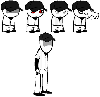 Credit to RockmanThetis for the Megaman-esque sprite, TheSilverTotodile For the Bad Batter Drawing, And Melthecoolcat for the one on the left of my batter. The batter to the right of my batter belongs to W00FSICLE , and the one next to W00F's is BrenBossLatte 's the one on the left of the megaman batter belongs to That-Person-Haven , the one without outline belongs to Fredbearthe , the one third to the left is 0FF-C4T , the smallest one next to megaman is ThatGoatAzzy , and the one on the far right belongs to CharoGaming99 , the one second on the far left is Pyeshii . The dank sprite on the far right is WingDingusGaster 's. The one infront of mine and W00F's is BeauNgamer . The dark-shaded one on the far left belongs to ZeddTheDrawingEnderm .