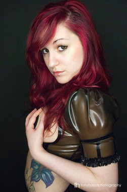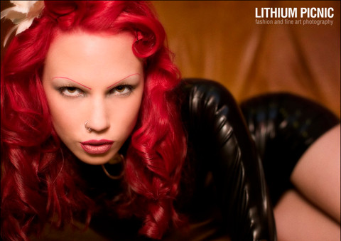 This is stunning! The contrast between the pale skin of the model, and the gorgeous colour of her hair, and the industrial dark of the set is fantastic. Colour, lighting, pose: all great!