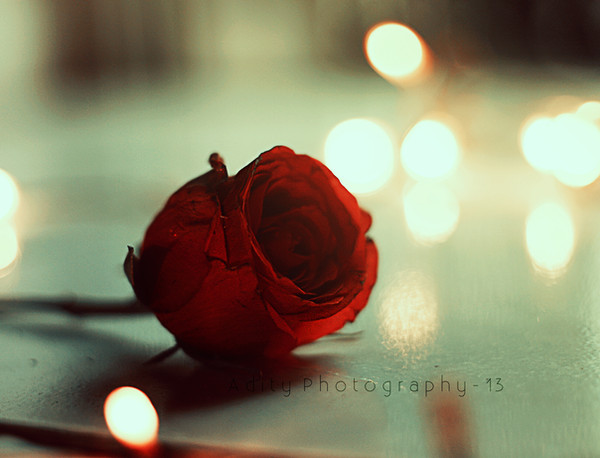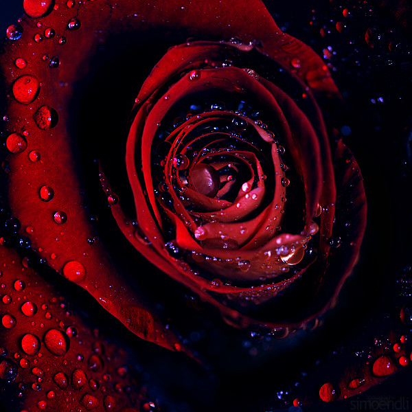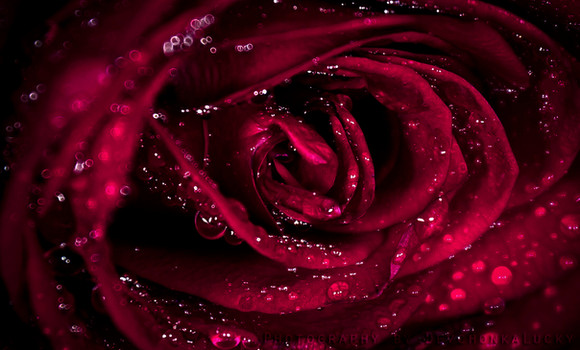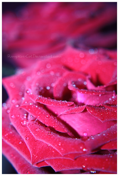 I think at first glance this photograph is very striking. I can tell you had a very steady hand when taking this shot especially because it's so close up. I think what really adds to the photo though not only that there are water droplets on the rose petals but you're able to see details through the water droplets. When you're taking pictures of anything red it can be challenging to get the tones right because I've noticed red will just all blend in sometimes. You've managed to keep the darks and lights beautifully separated and not make it one big contrasted photo. The colors in the background are one of my favorite things. The compliment the red very well and they look like like almost a beautiful garden. One thing I am noticing though is a lot of attention is drawn to the bottom left corner because there does seem to be more darkness there but that is an easy fix. You could easily you a reflecter if there's enough natural light. Honestly I love this picture though. It's very romantic and I'd hang it up in my house in a heartbeat. Keep doing this you obviously have skill.