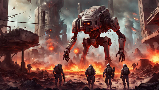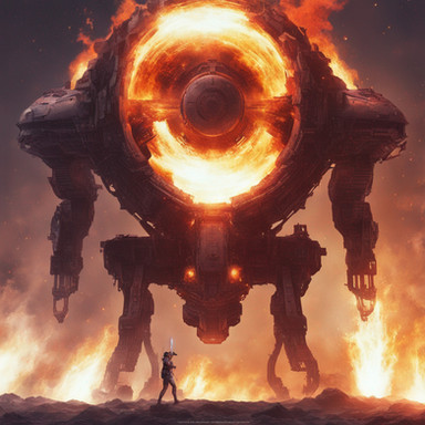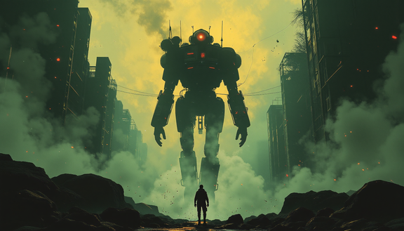"Confrontation" captures a moment of tension between man and machine. In this artwork, a lone individual stands face to face with a formidable mechanical entity. The man exudes a sense of determined resilience, his posture defiant of the impending threat. The vast, seemingly hostile machine is a marvel of industrial complexity, its cold, metallic form dominating the scene. The atmosphere is charged with a palpable sense of impending conflict, underscored by the austerity of the industrial backdrop. "Confrontation" depicts the classic theme of human courage in the face of overwhelming technological power, inviting the viewer to reflect on the nature of such an impasse and the history that has led to this critical moment.Related content