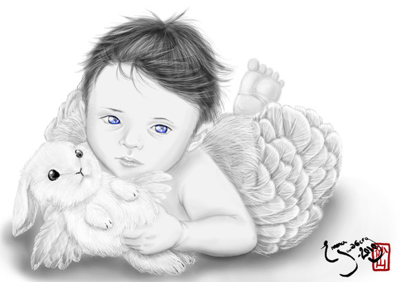 A commission for my wonderful patron Nicolas who requested his baby boy Valentine drawn in my fantasy world! So of course the Flutterbunnies from Clover Morning got in on it. ^___^ I thought a mobile might be a fun way to incorporate some of my iconic critters, too--my blue butterflies (Blues), a Flutterfawn, Snoots (the Mistress of Illusion), and Snailboy--anyone remember him?? That's going waaaay back, lol.Art ©Adele Lorienne