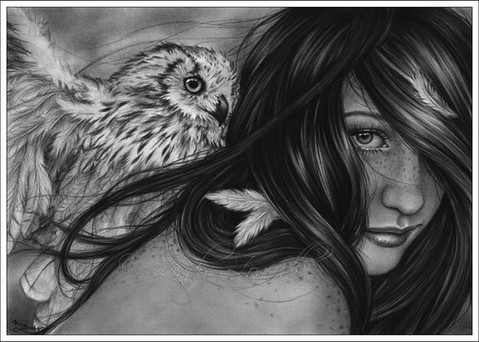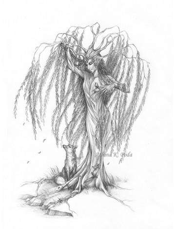 Faeren and the Mistress of Illusion, the embodiment of the Forest that shelters and imprisons him. She holds and guards him like a jealous lover while he sleeps, but during the day she appears to him only as a little golden-white creature. He calls her Snoots and considers her a pet, but I think perhaps the opposite is true....I had to force myself to work on this slowly, 2-4 hours every couple days so I wouldn't torture my wrist. It's taken three weeks from start to finish, and I haven't ground so many pencils' guts onto paper since "Awakening "... Only Faeren can persuade me to devote so much time to foliage...and he does it every time. *sigh* You can learn more about Faeren and "The Wars of Avenan" storyline here: www.meadowhaven.net/wars-of-av…