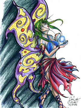 One of my favorites from 2006: Spark (the faerie) and Burnlight, characters belonging to *Winterdreamer This was my entry to an art contest she was hosting back then. Her characters were very intriguing, and it gave me an excuse to practice colored-pencils more. ^__^Art Β©me