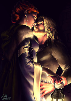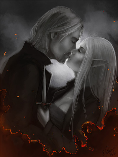Oh man this is so lovely! The shadow/light effects really make a dramatic scene that's both tender and a little dangerous. I think it sums those two up very well! ;; >> ANd it's adorable when the guy's a little shorter LOL XD
