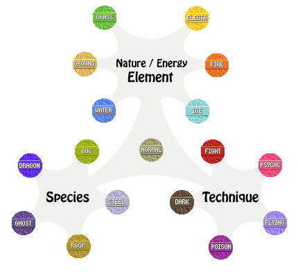 With the addition of Fairy to the franchise, I've tried to make sense of the types again, and now that the number is not a weird 17, but a nice 18, sorting them into 3 categories is not just possible but way simpler than before.So instead of 5+5+6+normal, its now 3 groups of 6 types each.