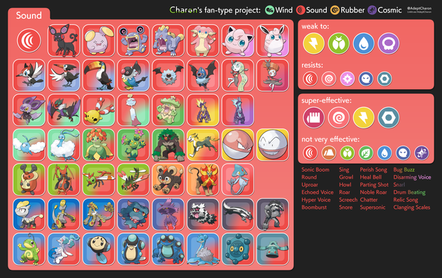 Interesting. What was the decision regarding the type effectiveness? It's very different to what I would have in my head for its strengths and weaknesses. I think sound-type is the only viable type option left (I feel like 'cosmic', another popular one, is covered by psychic types) and am always intrigued by what people hypothesize for it.