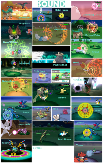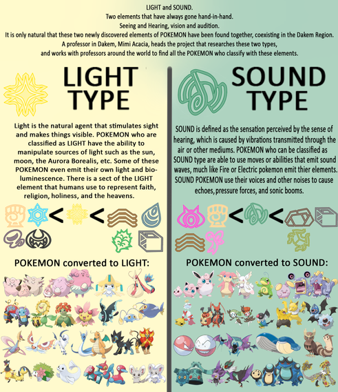 The easy targets for a weakness to Sound seemed types that feel like they're skills. Because when you have, say Psychic, I imagine a humanoid creature with superpowers with their mind as the source. I feel like Sound-moves would mess with their "skill" that they use for offense and defense. Same for Fighting. I can easily imagine an honest powerful trained fighter PKMN completely losing its focus and put off guard from being blasted by sound-moves. (other types I considered for similar reasons include Flying (since staying airborne is often an active process that needs to be kept alive, so disturbing that would attack the essence of a pure Flying type) and Dark (I mean you could argue that there's no hiding from sound-moves, as the waves propagate around any space and even through some obstacles), the only reason I exclude Dark is because it would cause quadruple weaknesses to Sound for type combinations that already have quadruple weaknesses (like Dark/Fighting would be 4x weak to fairy/sound, and Dark/Psy would be to bug/sound..)... but I will concede that the official type chart has some really bad cases as it is (Grass/Bug is really bad, and Rock/Steel is ridiculous with 2 glaring quad weaknesses considering its meant to be a combo of 2 very defensive types), so maybe the "quadruple weaknesses" themselves require some kind of adjustment, in which case I'd want to slap Dark in to Sounds victims as well.