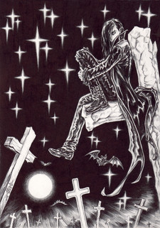 It's in charcoal, since I had a box of drawing supplies I'd never used and was feeling guilty about, and charcoal seemed right for the concept.