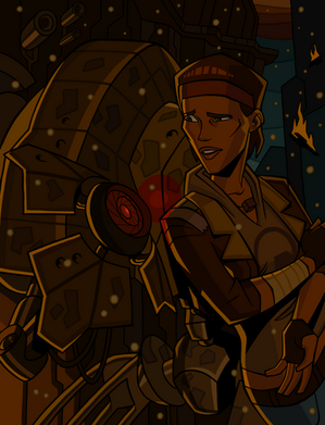 Hepzibah Lawrence was a Heavy weapons specialist at XCOM during the 2015 Alien invasion. After managing to escape the assault on XCOM HQ she headed back to Canada to reunite with her family. She returned however to find her hometown leveled and her family gone. Destraught she wandered north into the Canadian wilderness where she joined a group of other survivors and refuges. There she struggled to overcome the enourmous amount of guilt and loss of both her career at XCOM and her home. It was after a freak escape from a wildfire that things began to turn around for Hepzibah. After successfully leading 3 children from the wildfire she became trapped on the wrong side of a ravine. What seemed like a certain fiery death changed abruptly when a falling burning tree knocked her clean across the ravine. To onlookers it appeared as if she had been carried across by flaming wings. She mercifully landed in the arms of the others of her group and walked away with only bruises and slightly singed hair. From that moment on she became known as "The Phoenix". Finding hope in her survival she worked to rebuild her life and do as much as could for others.
