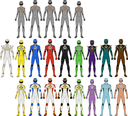 Third row: White Mystic Ranger, Gold Mystic Ranger (Solaris Knight), Silver Drive Ranger (Mercury Ranger, courtesy of [link] )