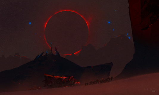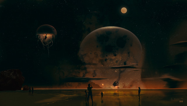 Second piece in a series inspired by radio dishes pointing at the heavens. We see a distant world around a binary red giant system. Radio signals are still at this point are the most efficiant source of communication for humankind.Related content