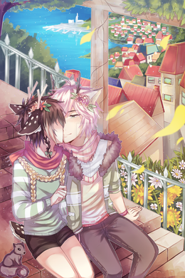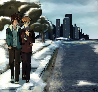 everything about this is seriously so perfect, from their outfits to your ever gorgeous backgrounds to the little people in the bg!! the background of my phone is the cityscape you've painted here it's SO pretty////