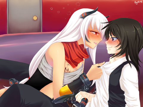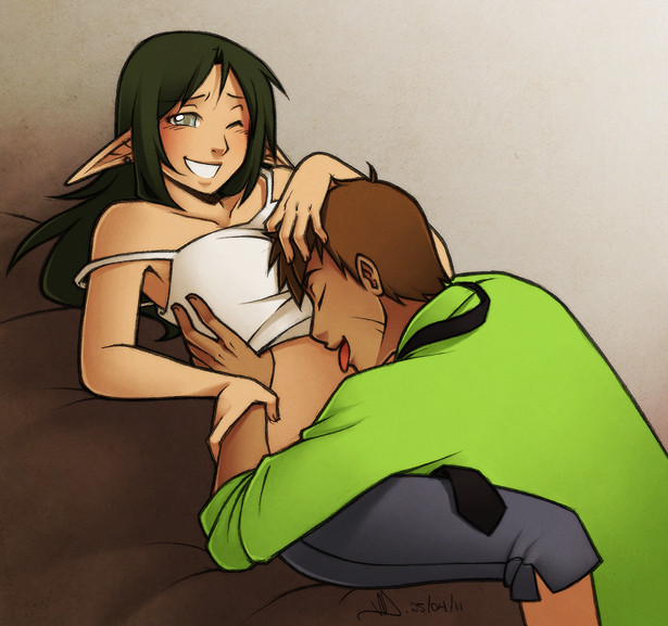 but anyways wowiez x///x arrgh his little hip ~~ you can make a black shirt so much more interesting hnnng these colors in the shading are killin me i could stare at your art all day blawhsghjdsf the magenta and slight greys in her orange hairs fffffffff