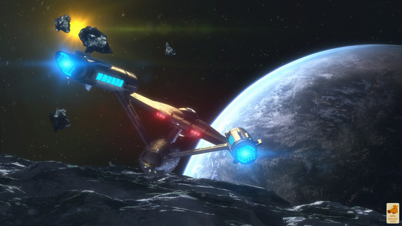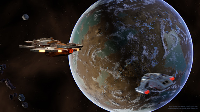 UES Seawolf, a Torsk-class light cruiser of the United Earth Stellar Navy, scouts a Romulan base in the Kaph-42 (Chi1 Orionis) starsystem.Chi1 Orionis is a binary system 28 lightyears from Earth. The primary star is a G0 type, with a Red Dwarf companion orbiting at a distance of between 3.3 and 8.9AU. We could imagine any hypothetical planet in the system being subjected to extreme seasons as the companion star passes nearby.
