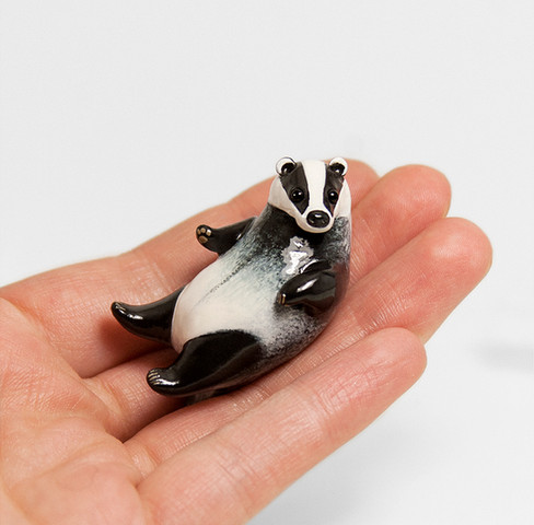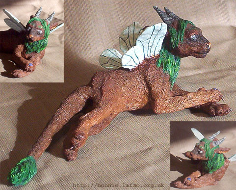 Super Sculpey over a wire and foil armature, painted with acrylics and sealed with spray varnish.