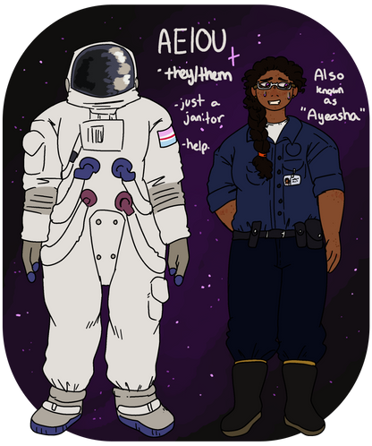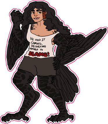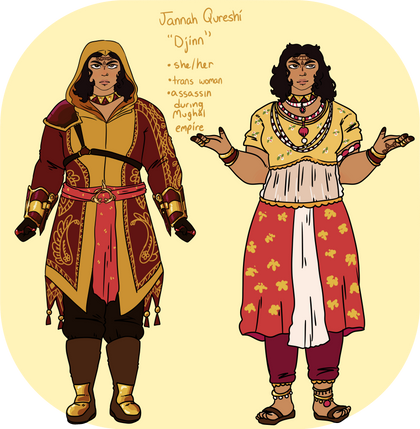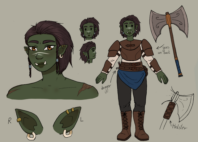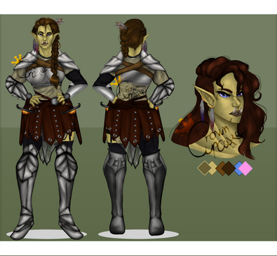 she's a qunari and her dad is iron bull; she's basically a Bastard child/accident due to iron bull sleeping around and rlly hates him for letting her even exist but she's 2% happy with living cause she's got a cute gf being the Inquisitor's daughter, Hella !! she meets her on accident and they're hunting buddies up until fiche realizes She is not just some random pretty wolf she's a Person!! but they remain friends and are they even dating? who knows, hella doesn't but fiche will always call her by "wife" which hela is neutral about