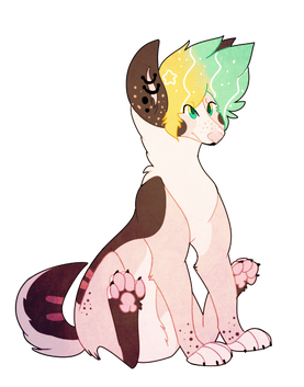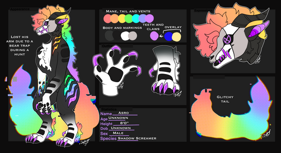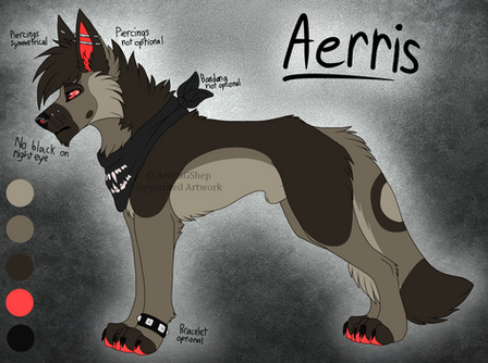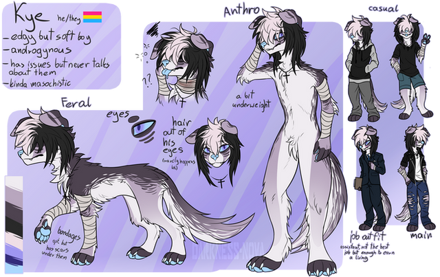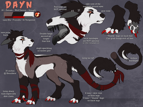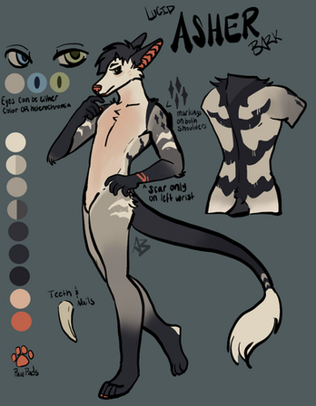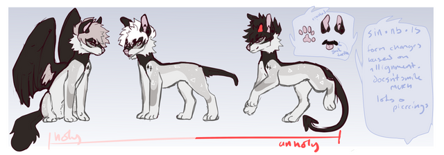 aight so i felt the need to change the color of his inner ears, pawpads, nose, ETC. thus, a new ref was bornhis design is symmetrical and his piercings aren't optional. all of his pawpads are red with black spots, but the spots can vary. his tongue is black.